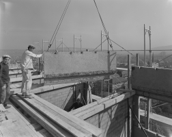 Beschreibung | Brüstungselement. Stahlbeton-Fertigteil, selbsttragende Fassade, aussen: Sichtbeton bewittert, innen: Putz/Tapete. Mit innenliegenden Aussparumgen (3 cm) für vormalige Korkdämmung (die Dämmung wird vor dem Wiedereinbau entfernt). | |